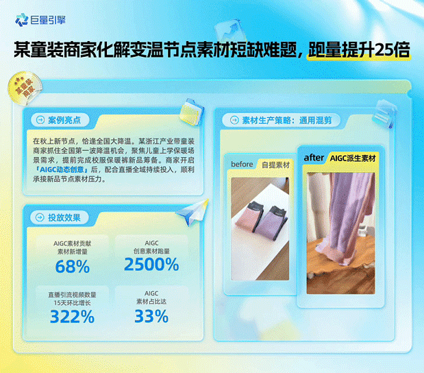 数据显示,开启「AIGC 动态创意」后,带动跑量提升超过10%,项目中的有消耗素材数增加30%,有消耗素材的生命周期延长超10%。