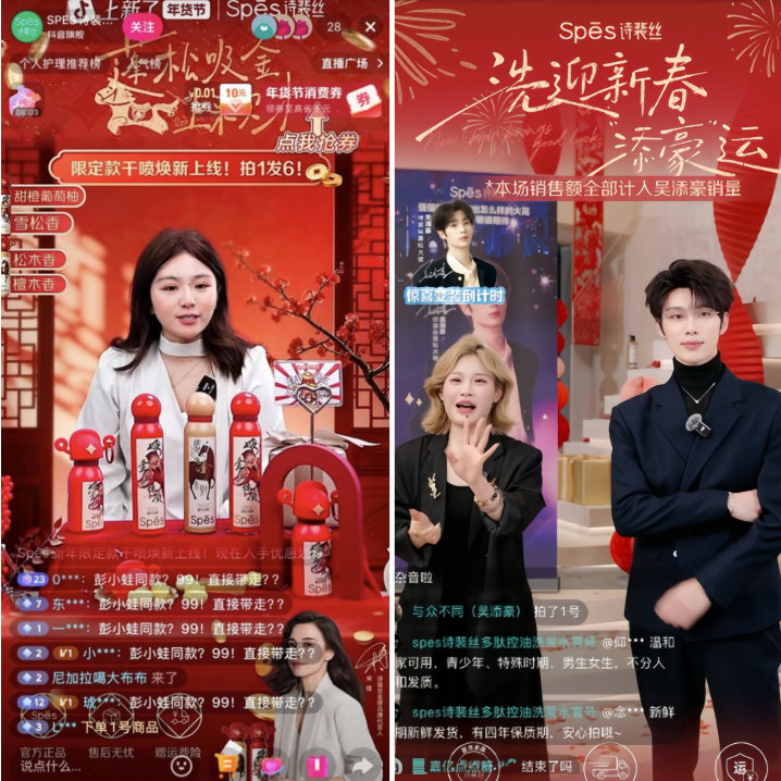 比如日化TOP商家Spēs诗裴丝,在年货节的产品主角是一款免洗空气感蓬松喷雾。跟普通产品不同,它采用了马年限定包装、搭载了“马上有钱”的美好寓意,让产品成为一款具有情绪价值与象征意义的潮品。此外配合热门短剧的植入、直播,放大了“拥有好用的产品=好运变富”的积极情绪。